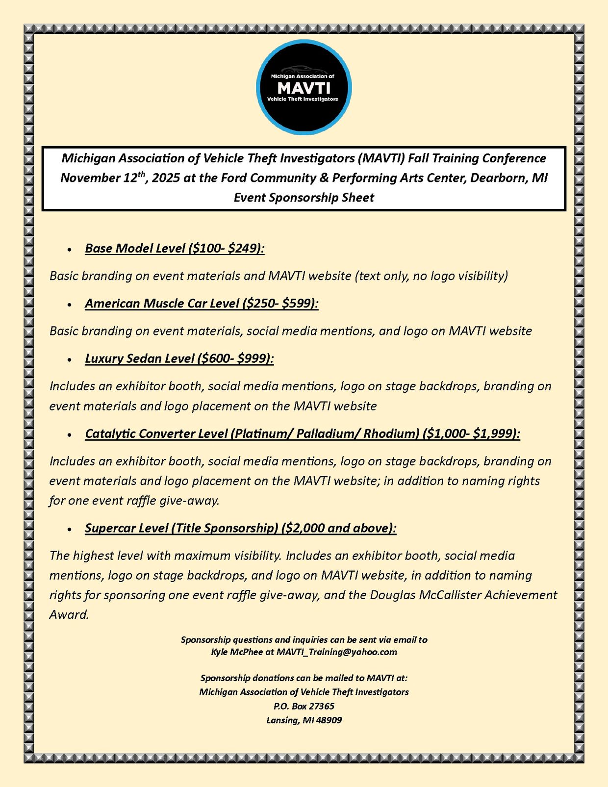 The 2025 MAVTI annual training conference is scheduled for November 12th, 2025 in Dearborn, Michigan. We have several sponsorship opportunities available toward supporting the 2025 conference. Soon we will be posting some of our sponsors that have already committed their support. Reminder- MAVTI is a registered 501(c)(3) organization.